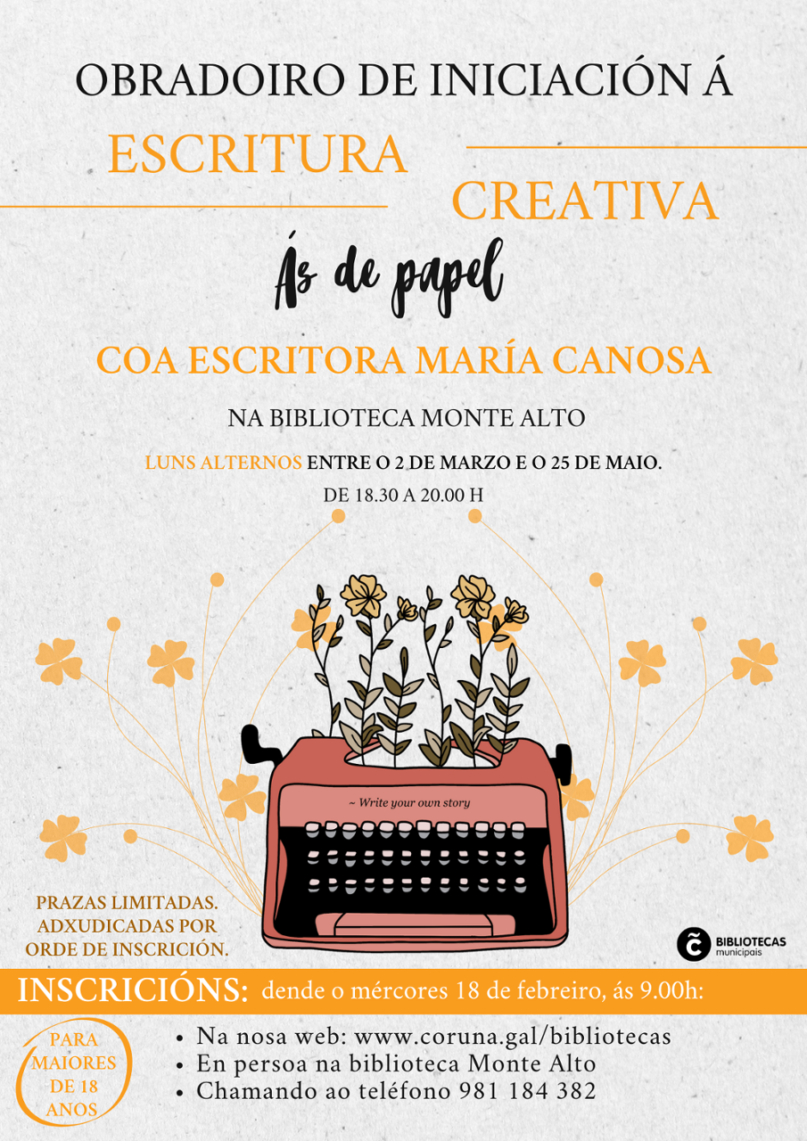 Explicaranse distintas estratexias para enfrontarse a un papel en branco, e realizaranse exercicios prácticos aplicándoas. Traballarase basicamente a narrativa, mais tamén se realizará unha pequena introdución á poesia. Quérese fomentar tamén a importancia da biblioteca e da lectura no proceso creativo da escritura.