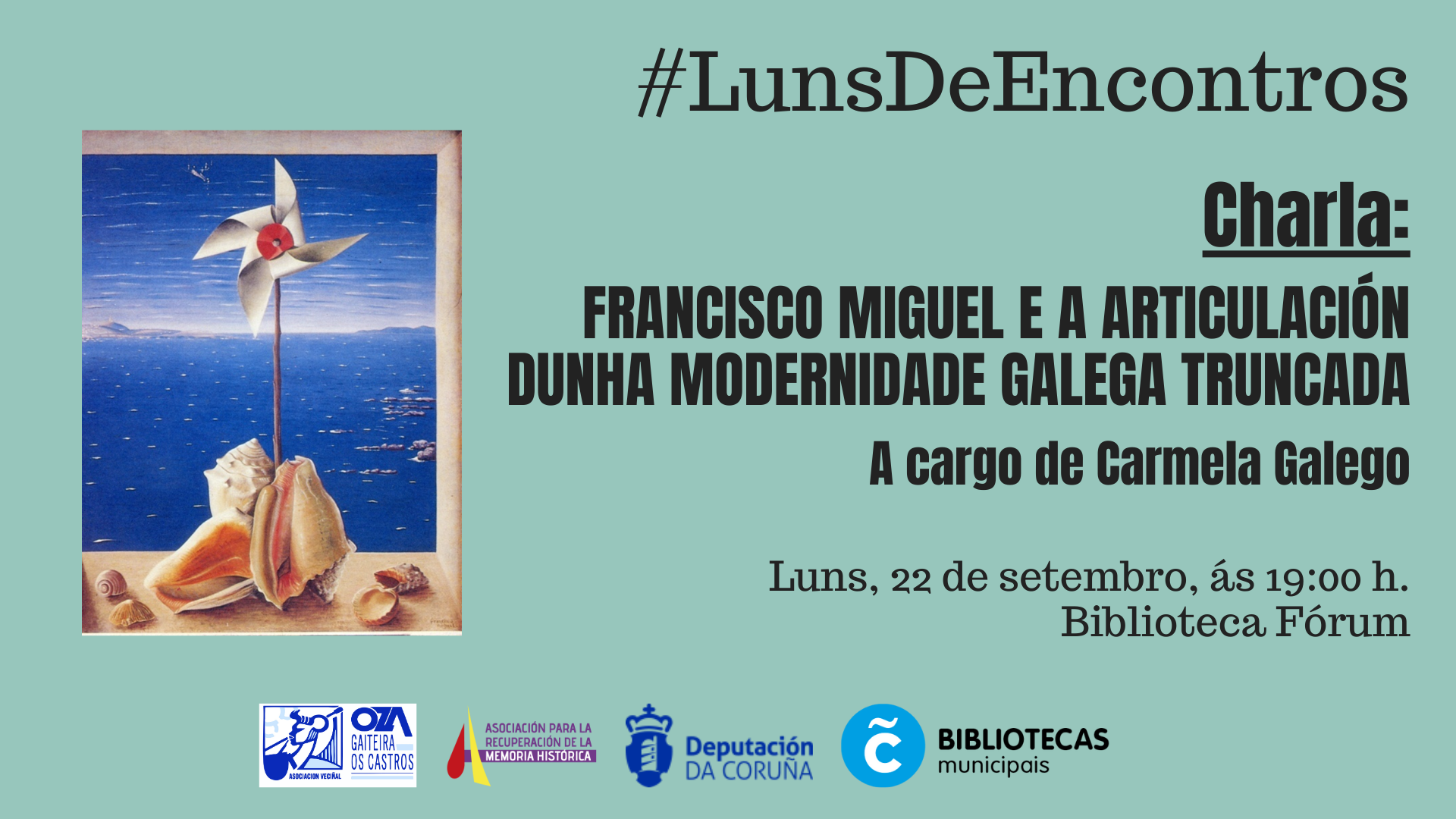 O luns 22 de setembro ás 19 h., na Biblioteca Fórum Metropolitano, temos a Charla "Francisco Miguel e a articulación dunha modernidade galega truncada" a cargo de Carmela Galego